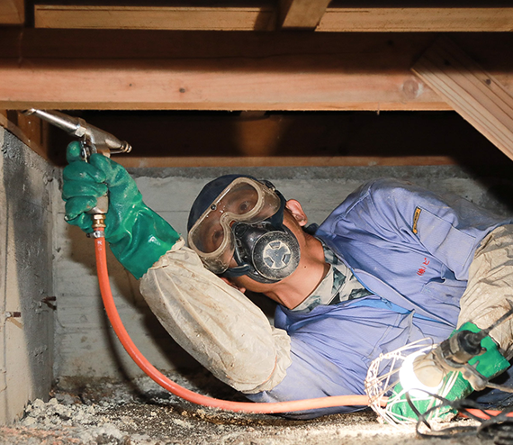 床下の木材や土壌、玄関・勝手口・浴室などへ薬剤の散布・注入を行います。 シロアリの進入を防ぎ、効果的に予防します。